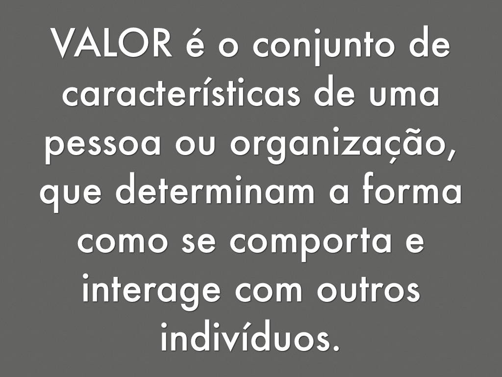 VALOR é o conjunto de características de uma pessoa ou organização, que determinam a forma como se comporta e interage com outros indivíduos.