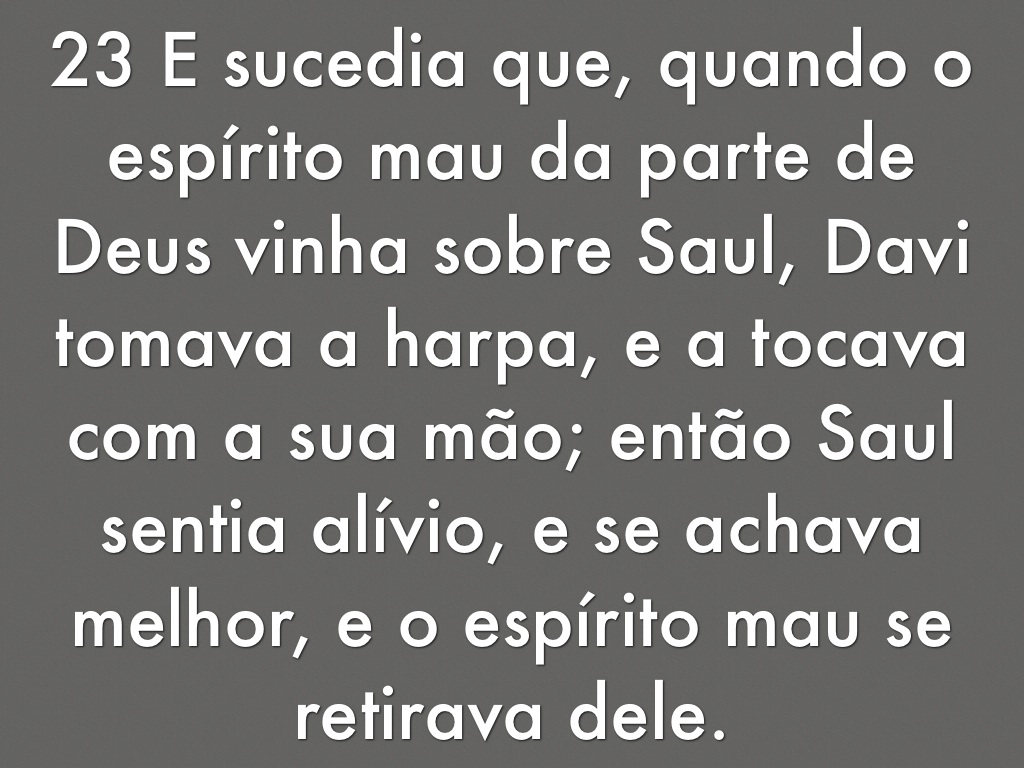 23 E sucedia que, quando o espírito mau da parte de Deus vinha sobre Saul, Davi tomava a harpa, e a tocava com a sua mão; então Saul sentia alívio, e se achava melhor, e o espírito mau se retirava dele.