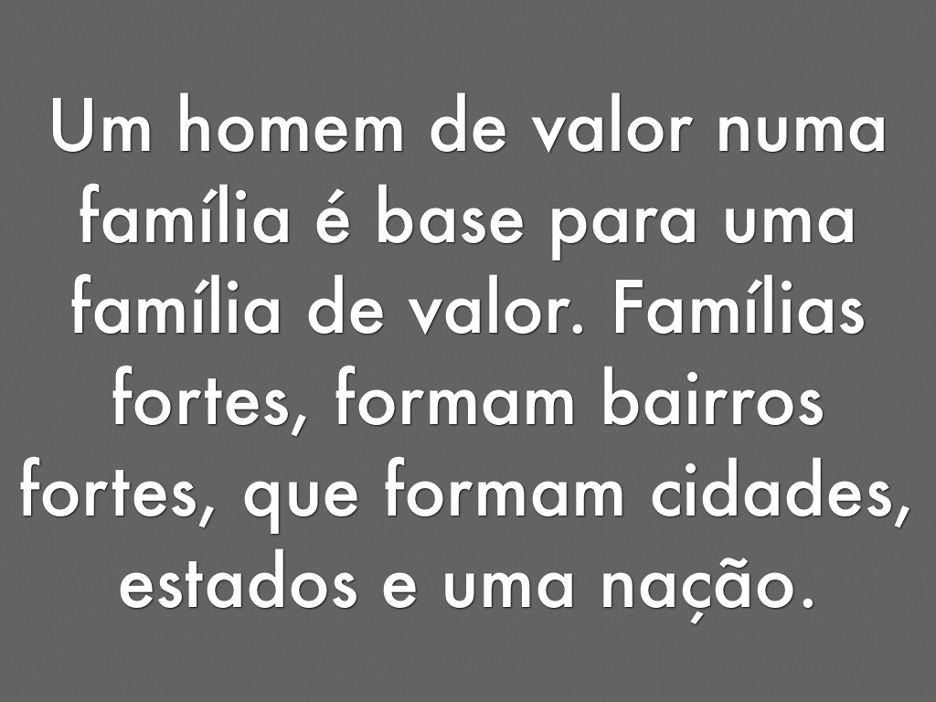 Um homem de valor numa família é base para uma família de valor. Famílias fortes, formam bairros fortes, que formam cidades, estados e uma nação.