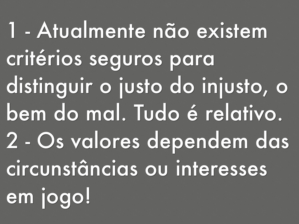 1 - Atualmente não existem critérios seguros para distinguir o justo do injusto, o bem do mal. Tudo é relativo.