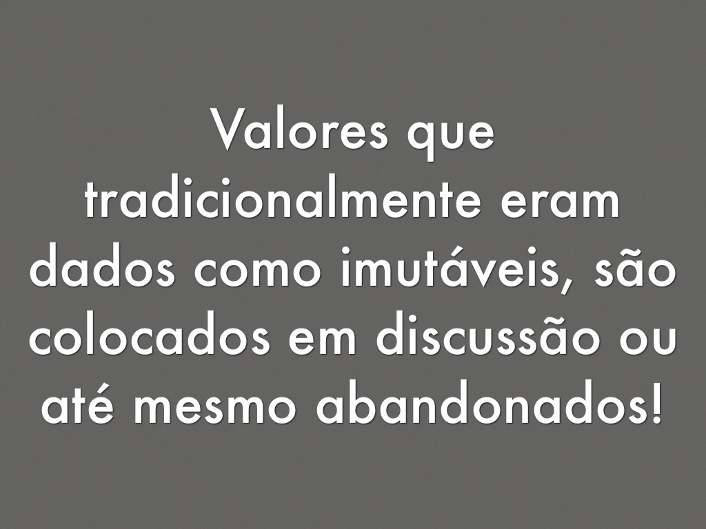 Valores que tradicionalmente eram dados como imutáveis, são colocados em discussão ou até mesmo abandonados!