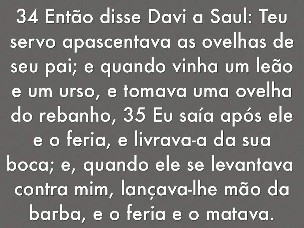 34 Então disse Davi a Saul: Teu servo apascentava as ovelhas de seu pai; e quando vinha um leão e um urso, e tomava uma ovelha do rebanho,