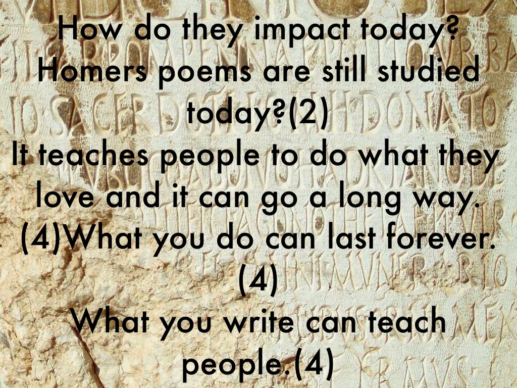How do they impact today? Homers poems are still studied today?(2) It teaches people to do what they love and it can go a long way. (4)What you do can last forever.(4) What you write can teach people.(4)