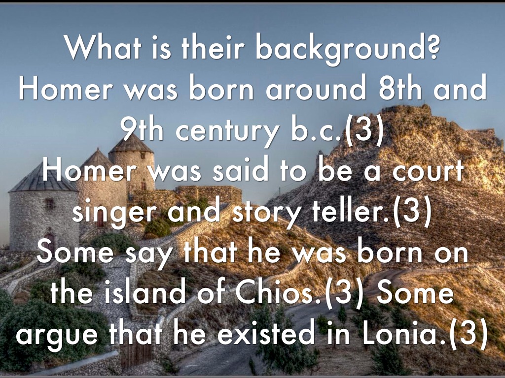 What is their background? Homer was born around 8th and 9th century b.c.(3) Homer was said to be a court singer and story teller.(3) Some say that he was born on the island of Chios.(3) Some argue that he existed in Lonia.(3)