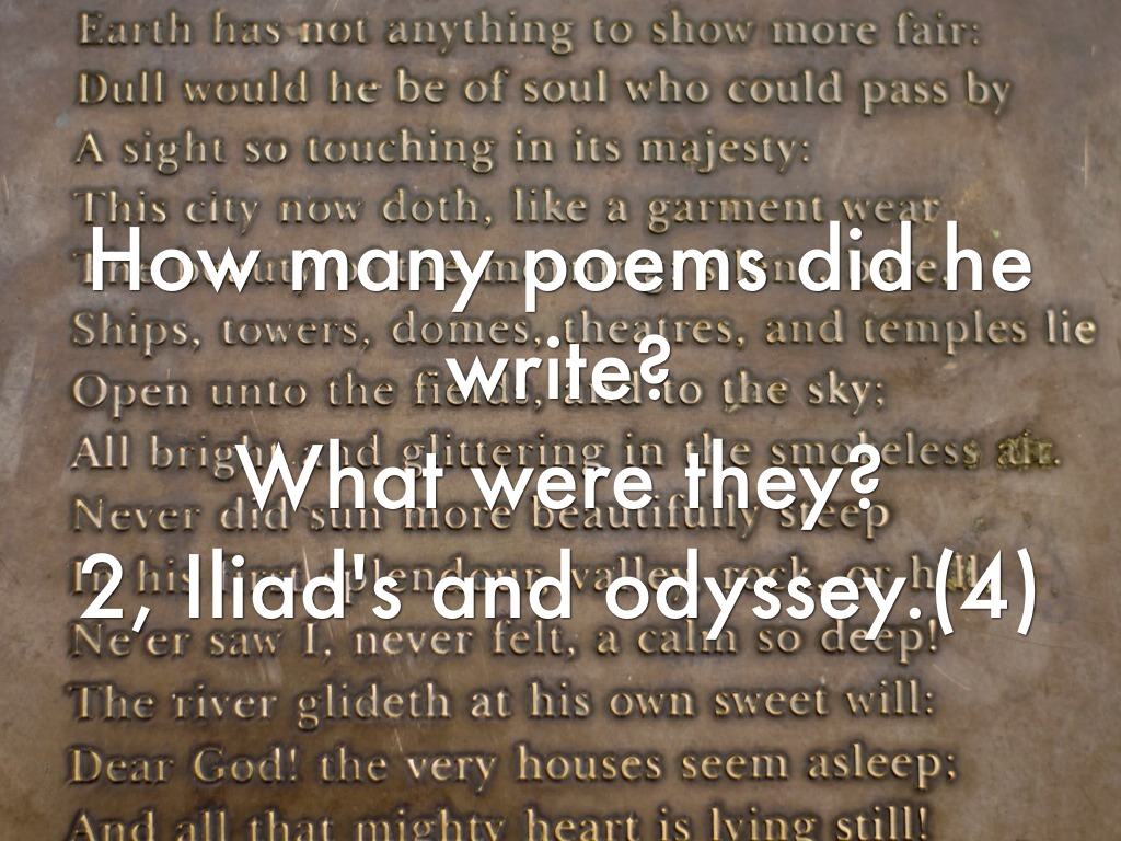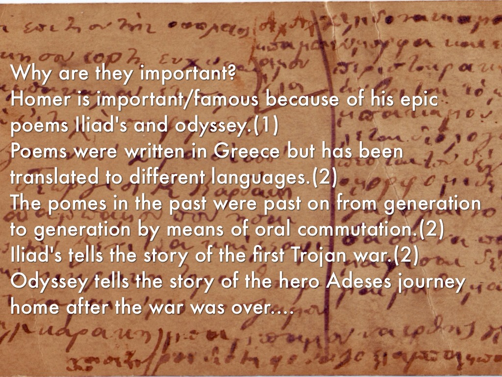 Why are they important? Homer is important/famous because of his epic poems Iliad's and odyssey.(1) Poems were written in Greece but has been translated to different languages.(2) The pomes in the past were past on from generation to generation by means of oral commutation.(2) Iliad's tells the story of the first Trojan war.(2) Odyssey tells the story of the hero Adeses journey home after the war was over.