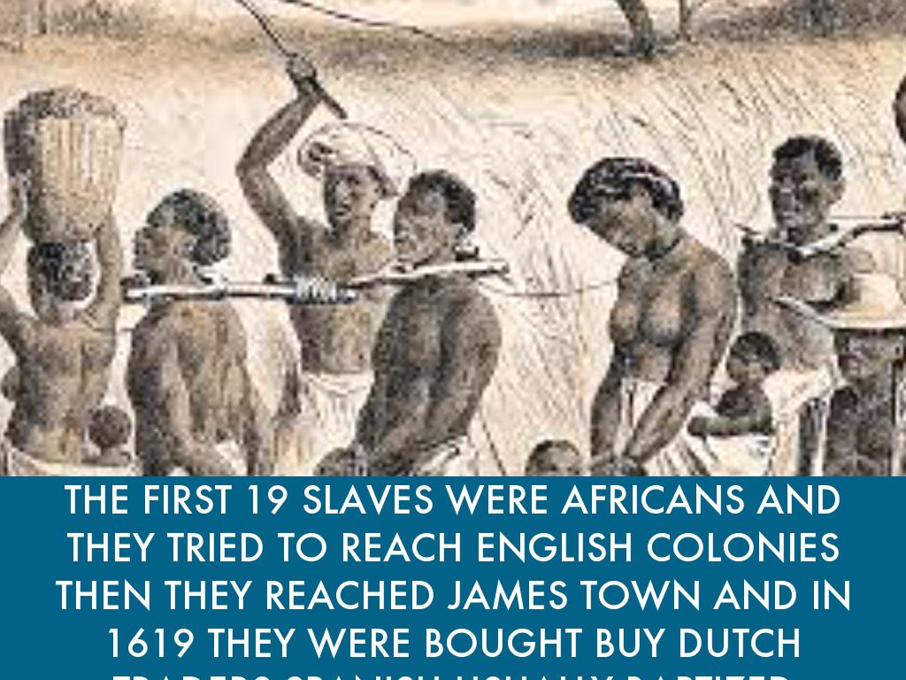 THE FIRST 19 SLAVES WERE AFRICANS AND THEY TRIED TO REACH ENGLISH COLONIES THEN THEY REACHED JAMES TOWN AND IN 1619 THEY WERE BOUGHT BUY DUTCH TRADERS SPANISH USUALLY BAPTIZED SLAVES