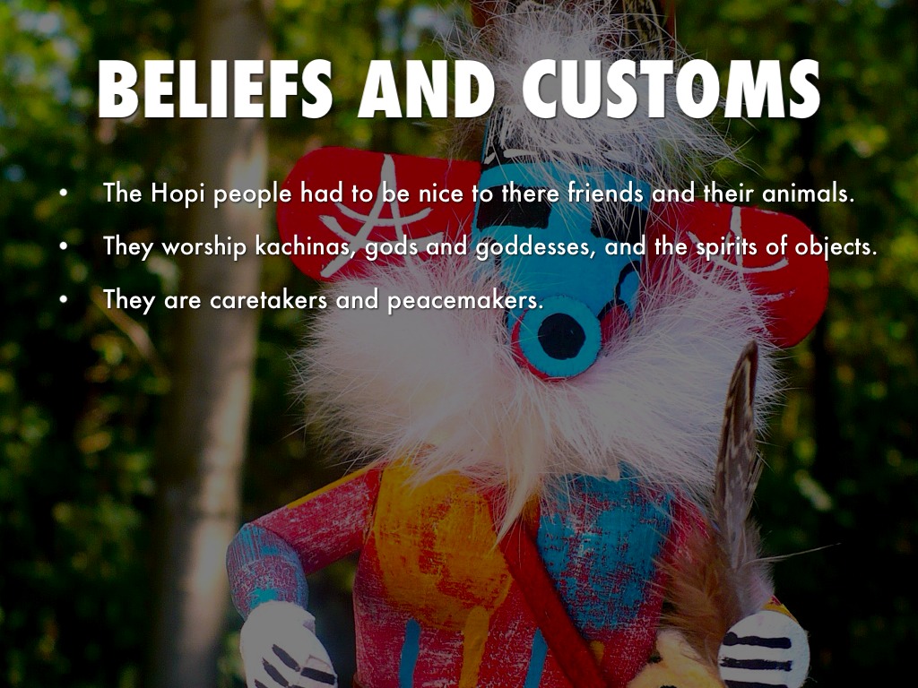 They worship kachinas, gods and goddesses, and the spirits of objects.