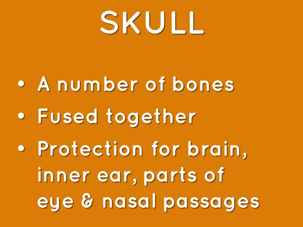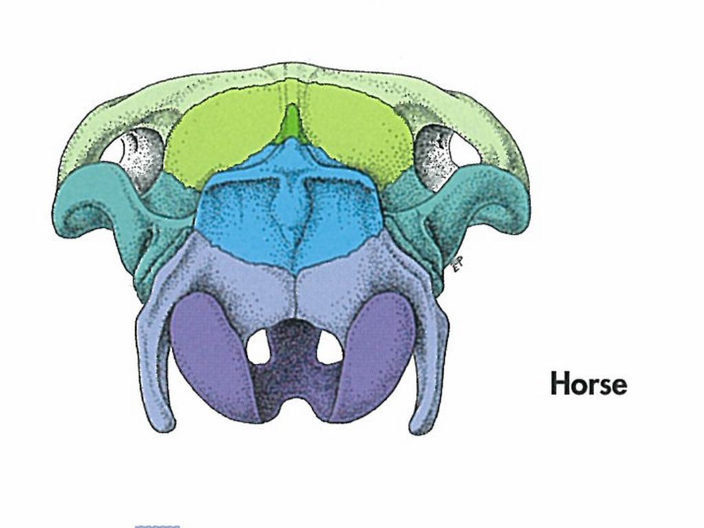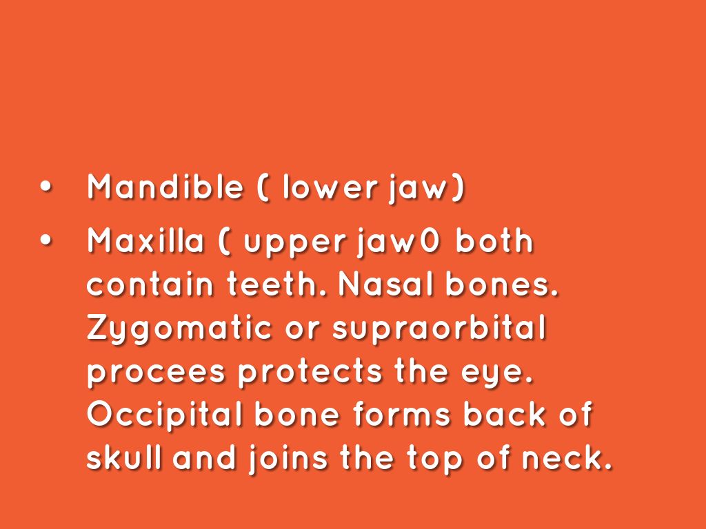Maxilla ( upper jaw0 both contain teeth. Nasal bones. Zygomatic or supraorbital procees protects the eye. Occipital bone forms back of skull and joins the top of neck.