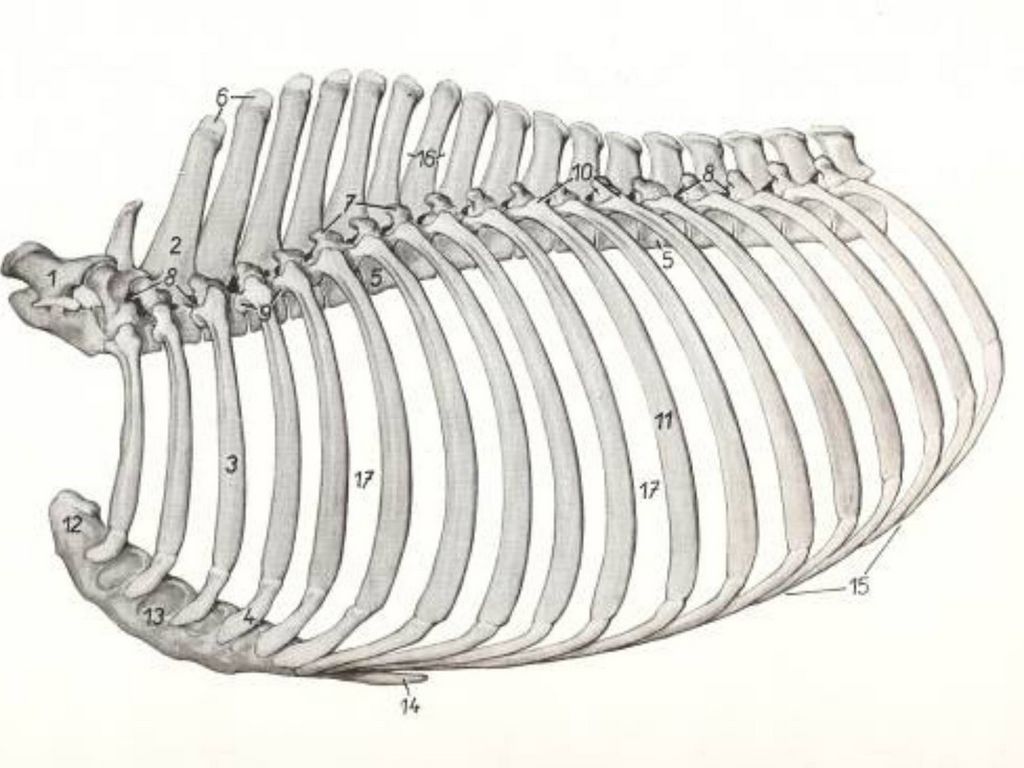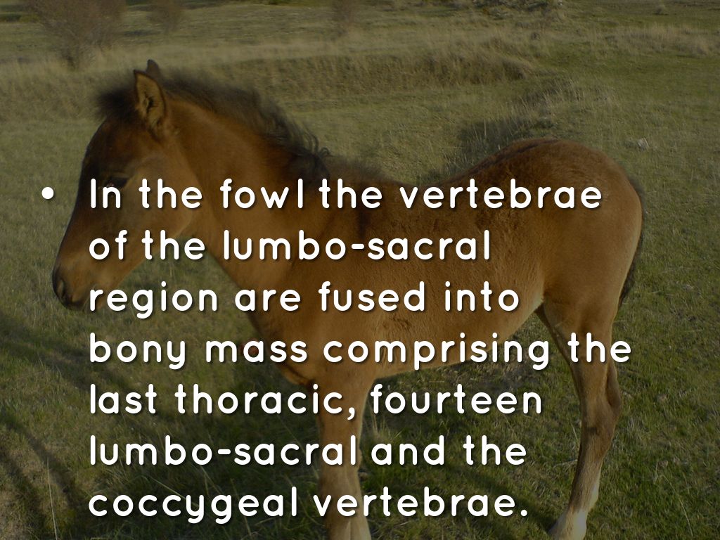 In the fowl the vertebrae of the lumbo-sacral region are fused into bony mass comprising the last thoracic, fourteen lumbo-sacral and the coccygeal vertebrae.