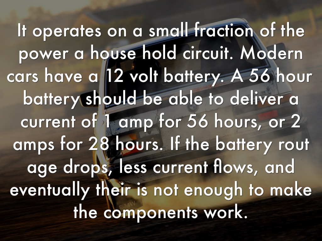 It operates on a small fraction of the power a house hold circuit. Modern cars have a 12 volt battery. A 56 hour battery should be able to deliver a current of 1 amp for 56 hours, or 2 amps for 28 hours. If the battery rout age drops, less current flows, and eventually their is not enough to make the components work.