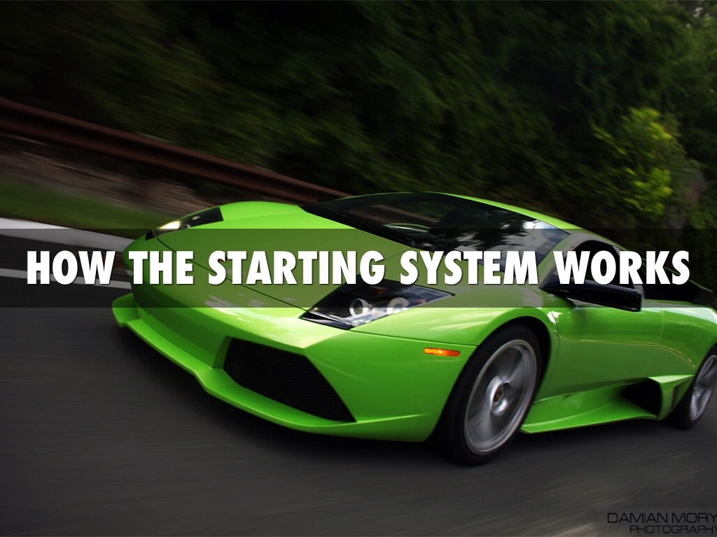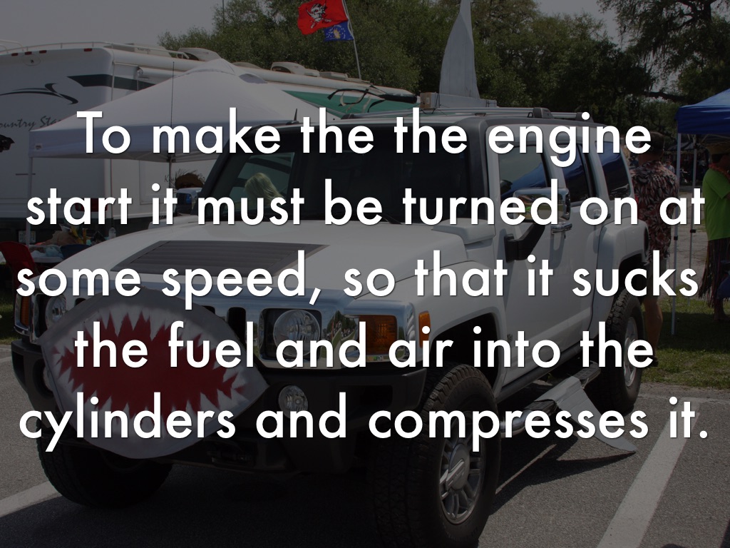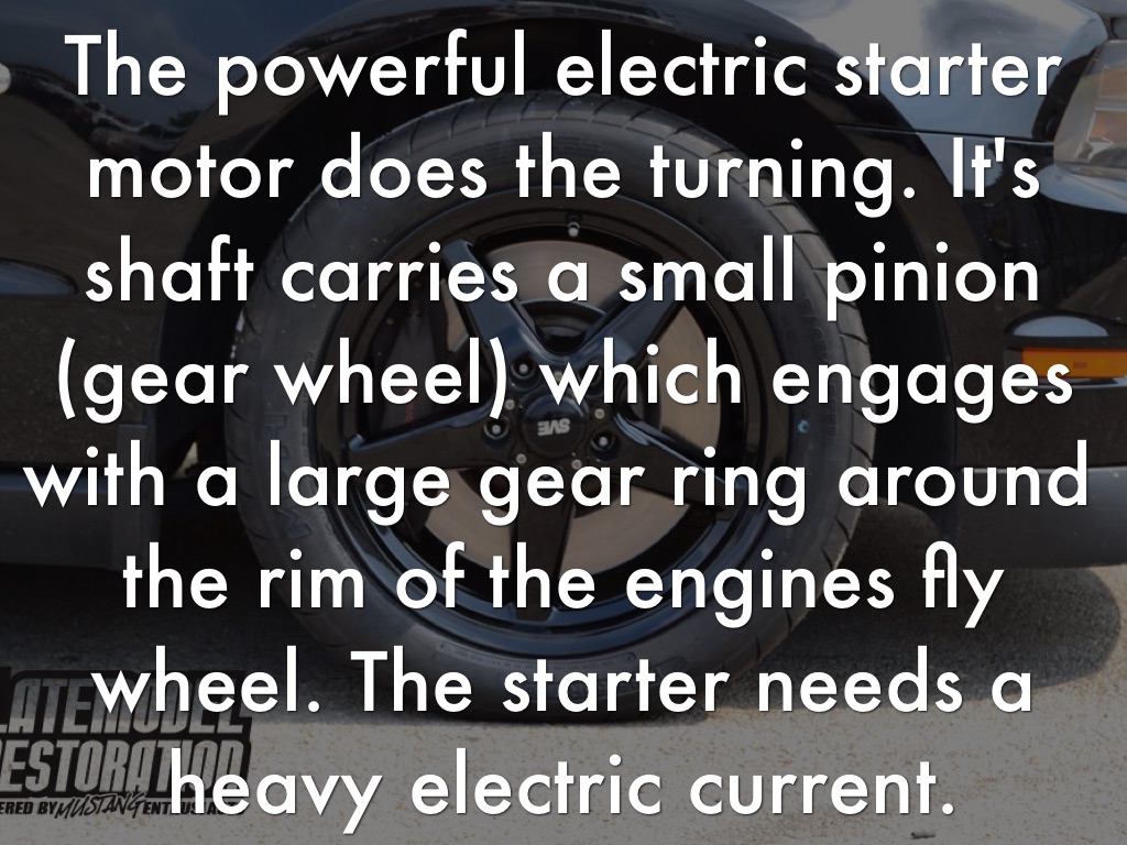 The powerful electric starter motor does the turning. It's shaft carries a small pinion (gear wheel) which engages with a large gear ring around the rim of the engines fly wheel. The starter needs a heavy electric current.