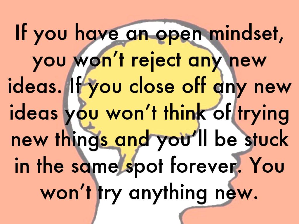 If you have an open mindset, you won’t reject any new ideas. If you close off any new ideas you won’t think of trying new things and you’ll be stuck in the same spot forever. You won’t try anything new.