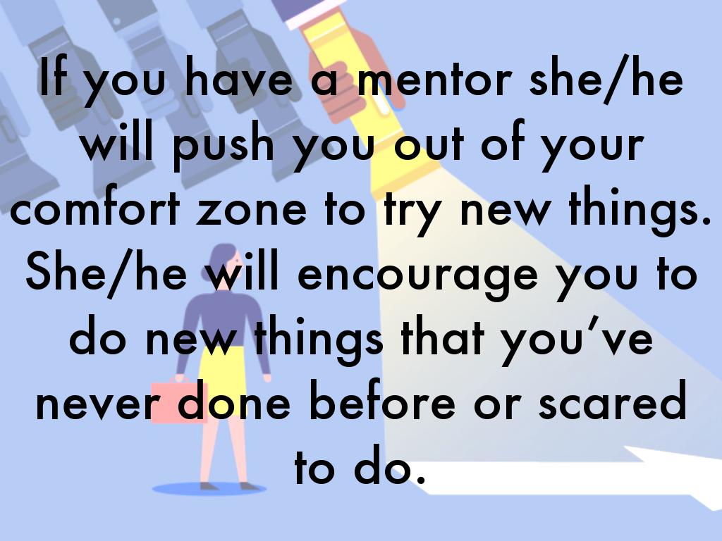 If you have a mentor she/he will push you out of your comfort zone to try new things. She/he will encourage you to do new things that you’ve never done before or scared to do.