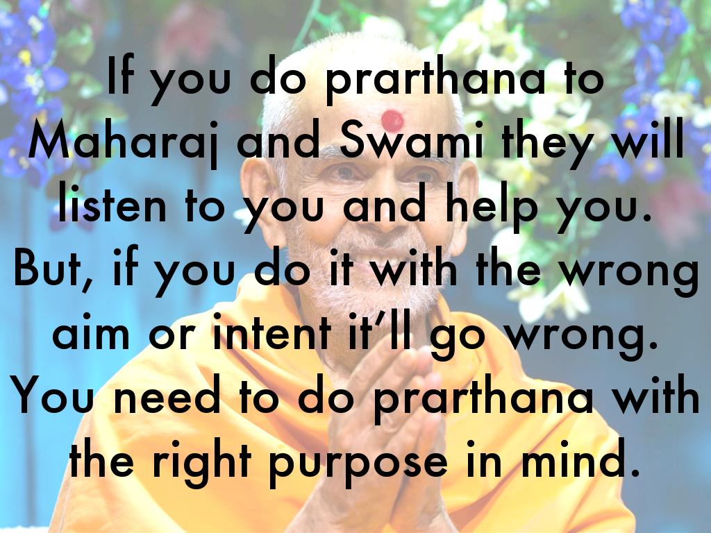 If you do prarthana to Maharaj and Swami they will listen to you and help you. But, if you do it with the wrong aim or intent it’ll go wrong. You need to do prarthana with the right purpose in mind.