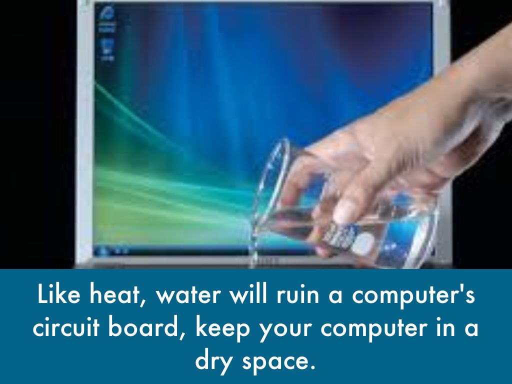 Like heat, water will ruin a computer's circuit board, keep your computer in a dry space.