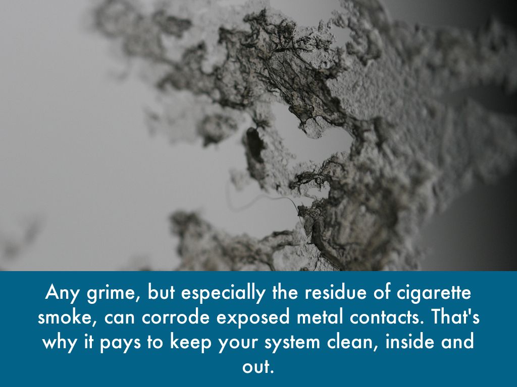Any grime, but especially the residue of cigarette smoke, can corrode exposed metal contacts. That's why it pays to keep your system clean, inside and out.