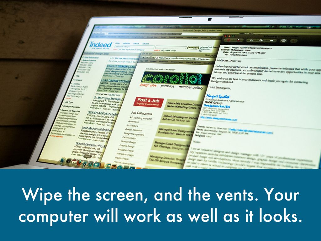 Wipe the screen, and the vents. Your computer will work as well as it looks.