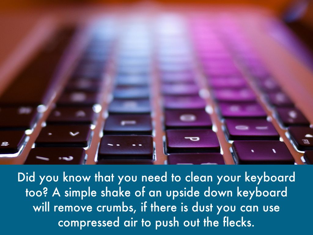 Did you know that you need to clean your keyboard too? A simple shake of an upside down keyboard will remove crumbs, if there is dust you can use compressed air to push out the flecks.
