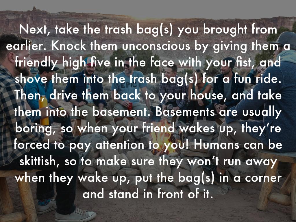 Next, take the trash bag(s) you brought from earlier. Knock them unconscious by giving them a friendly high five in the face with your fist, and shove them into the trash bag(s) for a fun ride. Then, drive them back to your house, and take them into the basement. Basements are usually boring, so when your friend wakes up, they’re forced to pay attention to you! Humans can be skittish, so to make sure they won’t run away when they wake up, put the bag(s) in a corner and stand in front of it.