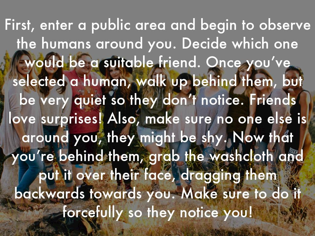 First, enter a public area and begin to observe the humans around you. Decide which one would be a suitable friend. Once you’ve selected a human, walk up behind them, but be very quiet so they don’t notice. Friends love surprises! Also, make sure no one else is around you, they might be shy. Now that you’re behind them, grab the washcloth and put it over their face, dragging them backwards towards you. Make sure to do it forcefully so they notice you!