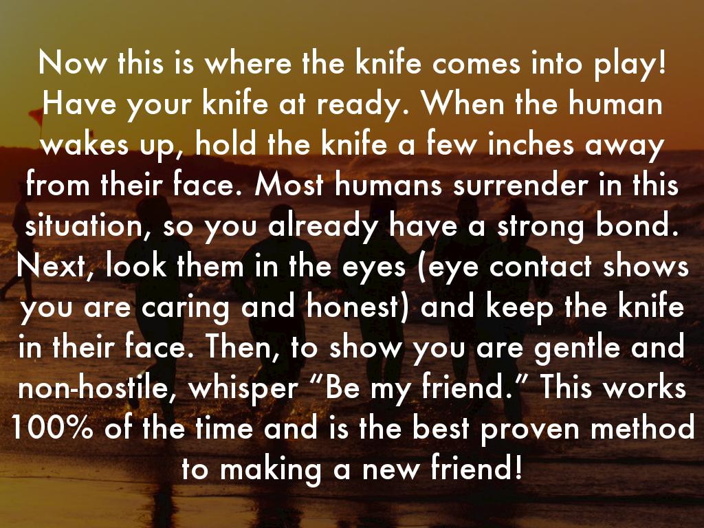 Now this is where the knife comes into play! Have your knife at ready. When the human wakes up, hold the knife a few inches away from their face. Most humans surrender in this situation, so you already have a strong bond. Next, look them in the eyes (eye contact shows you are caring and honest) and keep the knife in their face. Then, to show you are gentle and non-hostile, whisper “Be my friend.” This works 100% of the time and is the best proven method to making a new friend!