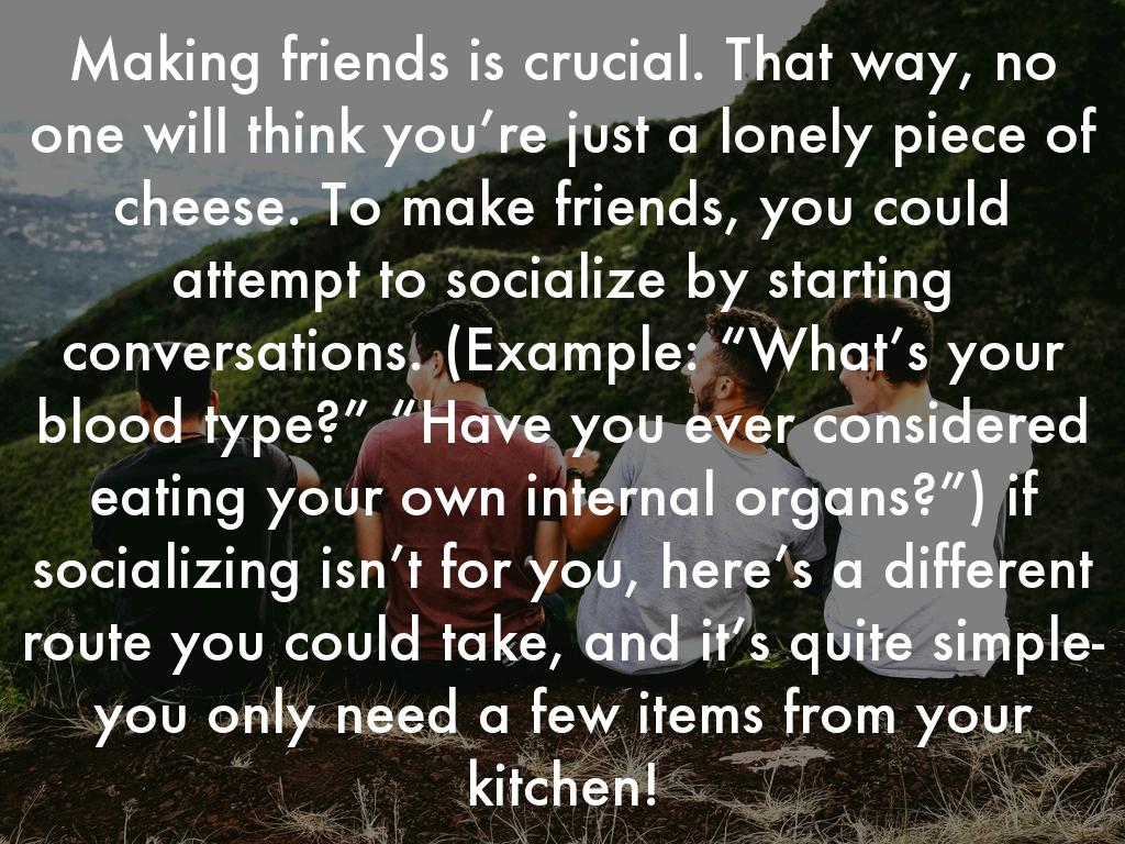 Making friends is crucial. That way, no one will think you’re just a lonely piece of cheese. To make friends, you could attempt to socialize by starting conversations. (Example: “What’s your blood type?” “Have you ever considered eating your own internal organs?”) if socializing isn’t for you, here’s a different route you could take, and it’s quite simple- you only need a few items from your kitchen!