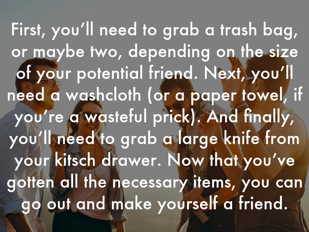 First, you’ll need to grab a trash bag, or maybe two, depending on the size of your potential friend. Next, you’ll need a washcloth (or a paper towel, if you’re a wasteful prick). And finally, you’ll need to grab a large knife from your kitsch drawer. Now that you’ve gotten all the necessary items, you can go out and make yourself a friend.