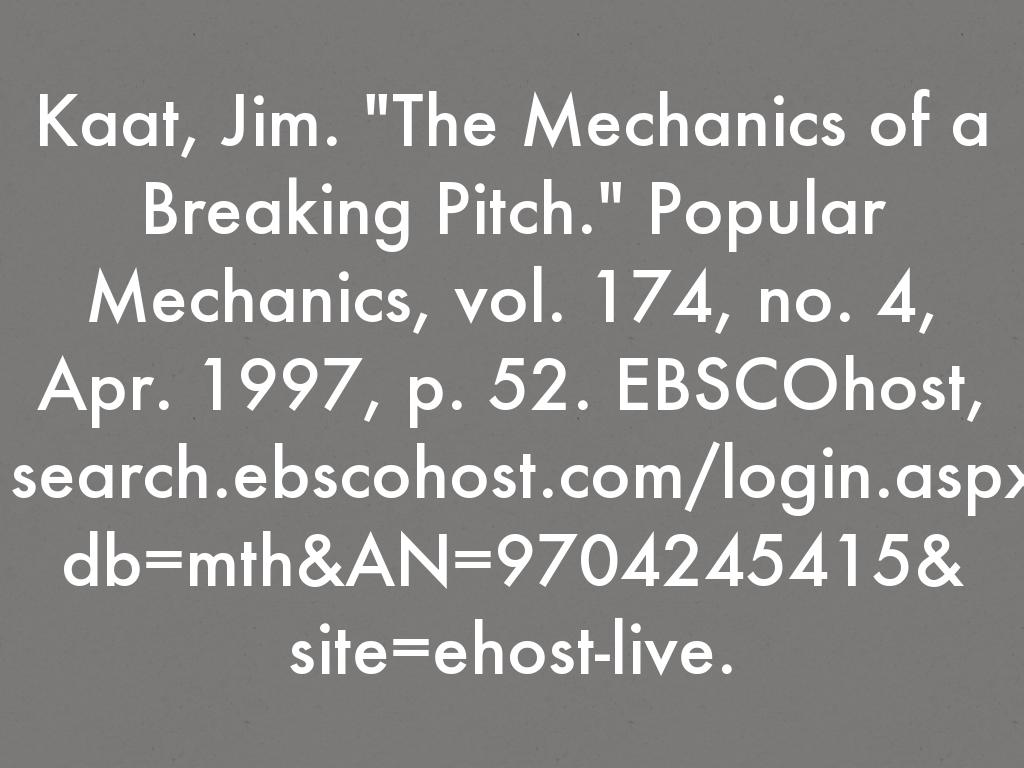 Kaat, Jim. "The Mechanics of a Breaking Pitch." Popular Mechanics, vol. 174, no. 4, Apr. 1997, p. 52. EBSCOhost,