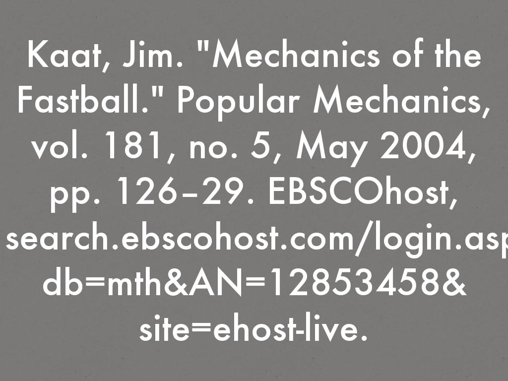 Kaat, Jim. "Mechanics of the Fastball." Popular Mechanics, vol. 181, no. 5, May 2004, pp. 126–29. EBSCOhost,