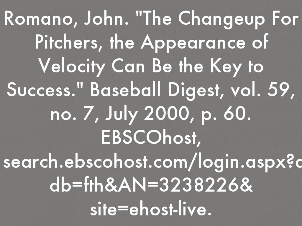 Romano, John. "The Changeup For Pitchers, the Appearance of Velocity Can Be the Key to Success." Baseball Digest, vol. 59, no. 7, July 2000, p. 60. EBSCOhost,