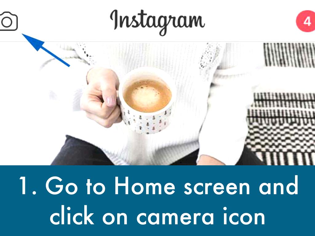 To create an Instagram Story, go to the Home screen and click on the camera icon at the top left-hand corner of the screen.