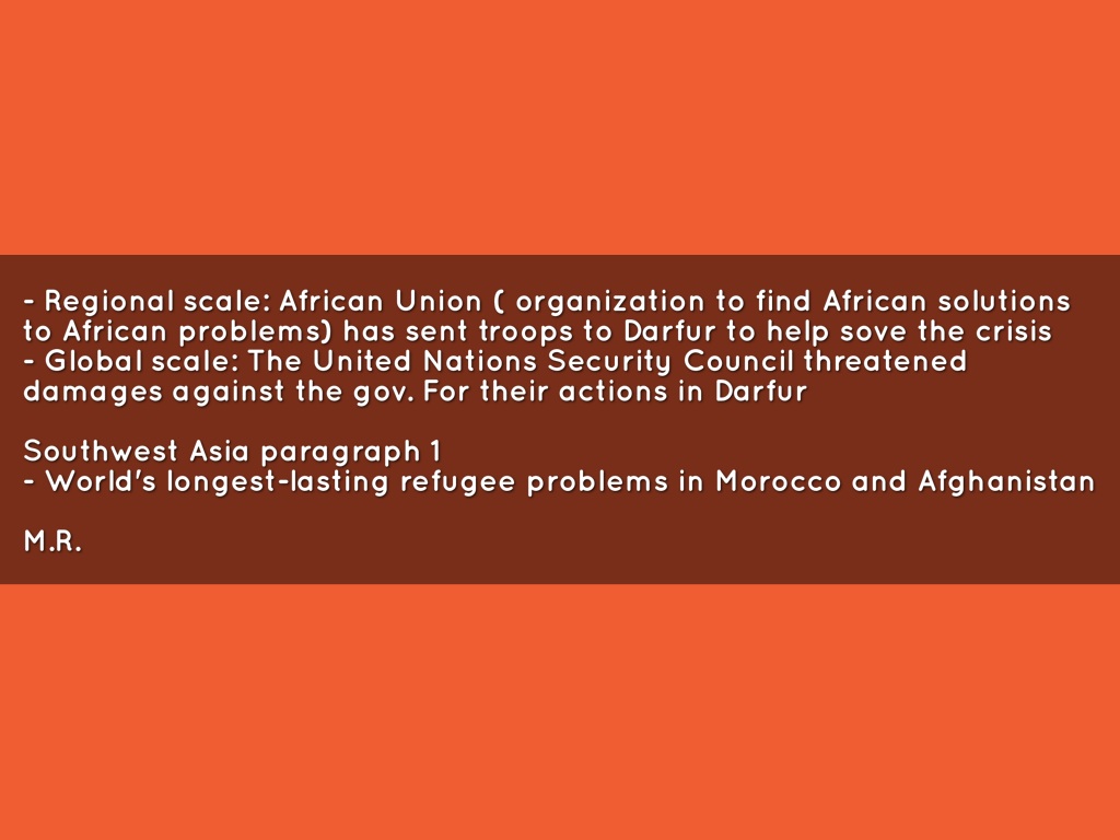 - Regional scale: African Union ( organization to find African solutions to African problems) has sent troops to Darfur to help sove the crisis