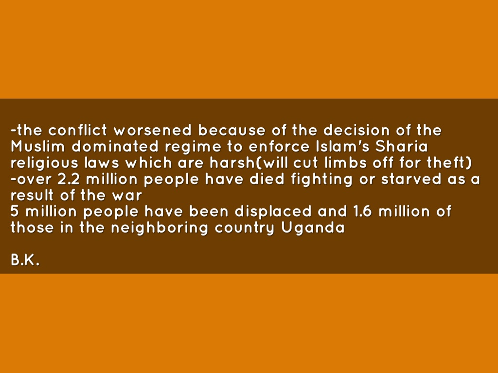 -the conflict worsened because of the decision of the Muslim dominated regime to enforce Islam's Sharia religious laws which are harsh(will cut limbs off for theft)