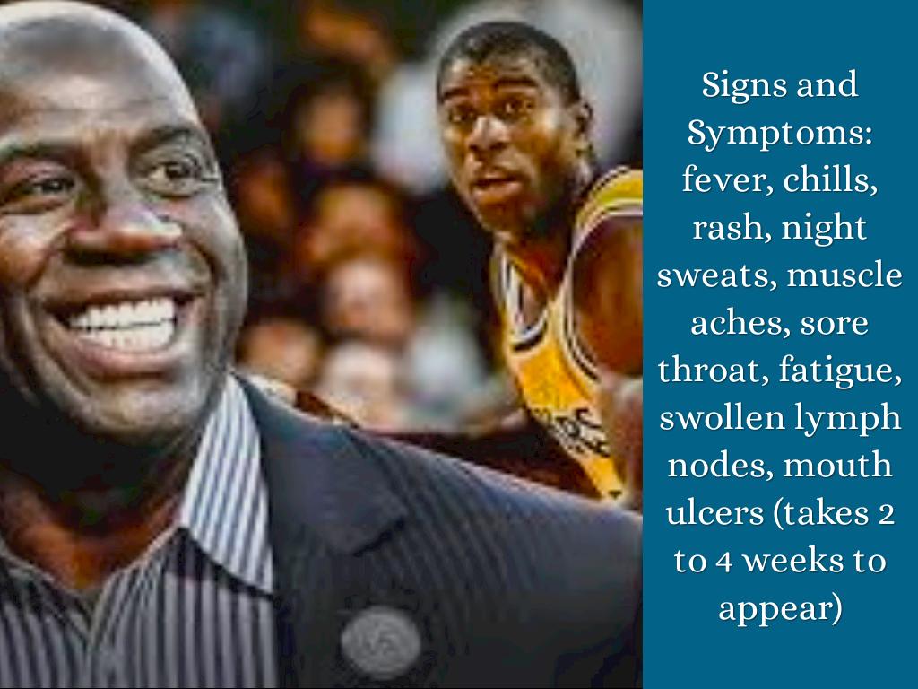 fever, chills, rash, night sweats, muscle aches, sore throat, fatigue, swollen lymph nodes, mouth ulcers (takes 2 to 4 weeks to appear)