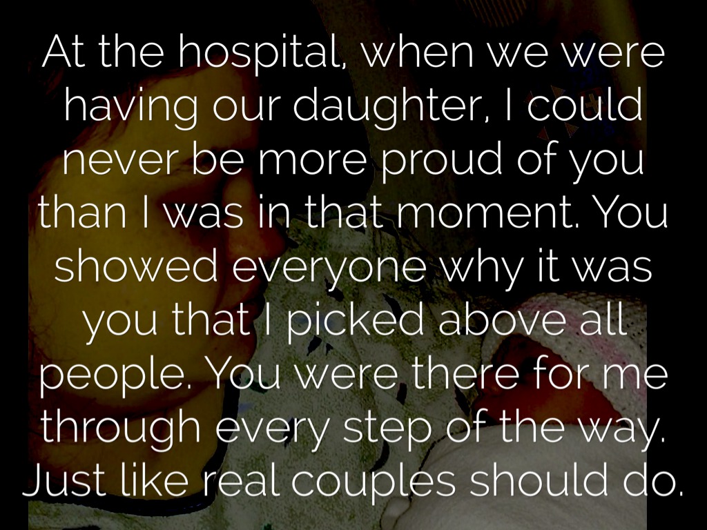 At the hospital, when we were having our daughter, I could never be more proud of you than I was in that moment. You showed everyone why it was you that I picked above all people. You were there for me through every step of the way. Just like real couples should do.