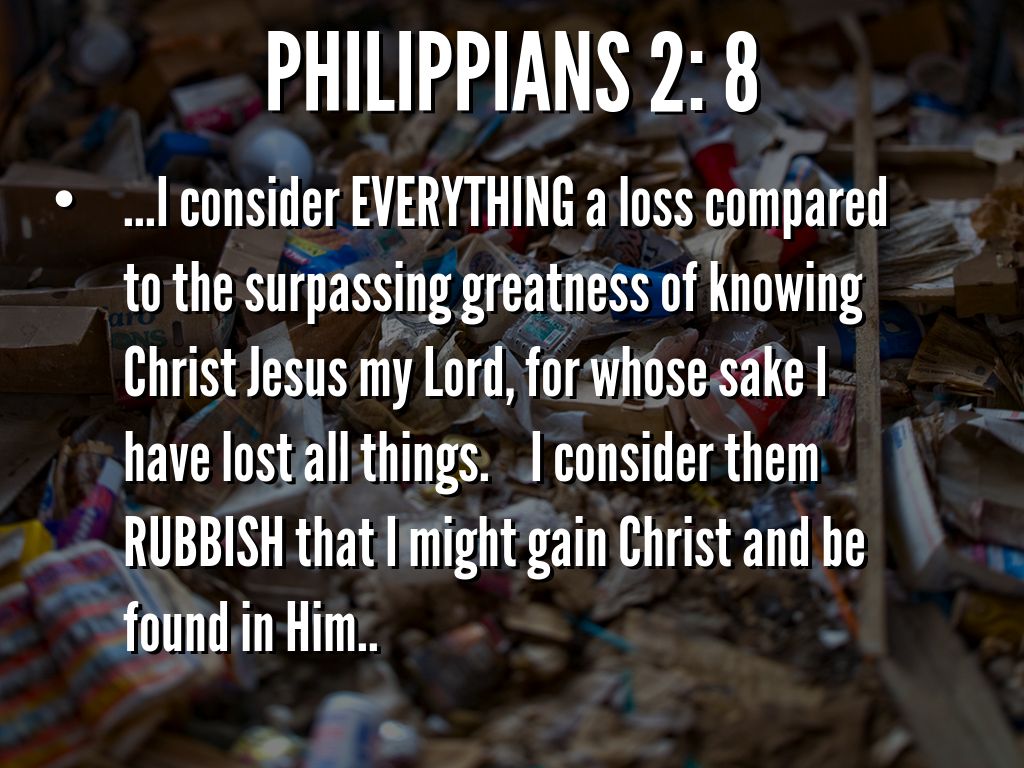 ...I consider EVERYTHING a loss compared to the surpassing greatness of knowing Christ Jesus my Lord, for whose sake I have lost all things. I consider them RUBBISH that I might gain Christ and be found in Him..