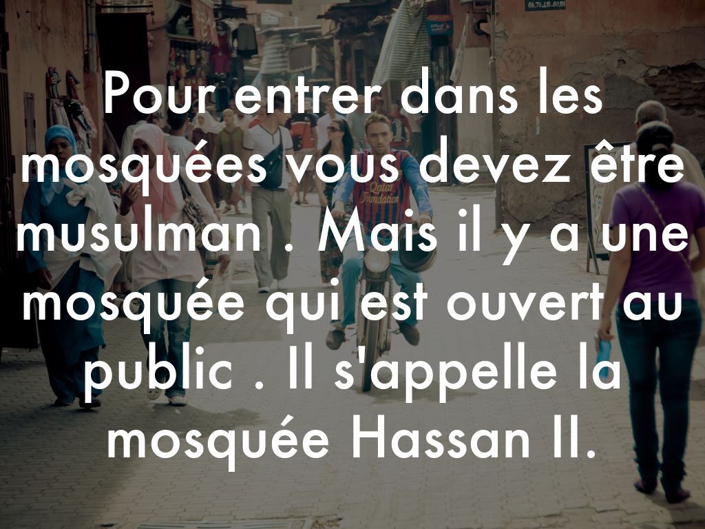 Pour entrer dans les mosquées vous devez être musulman . Mais il y a une mosquée qui est ouvert au public . Il s'appelle la mosquée Hassan II.