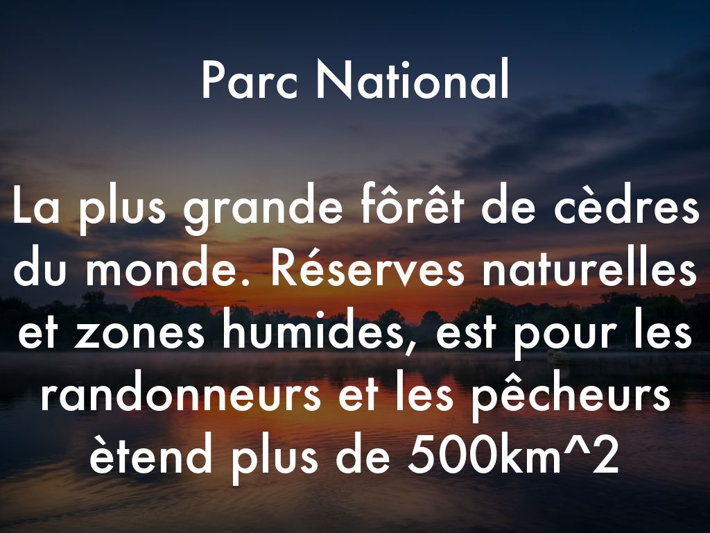 La plus grande fôrêt de cèdres du monde. Réserves naturelles et zones humides, est pour les randonneurs et les pêcheurs ètend plus de 500km^2