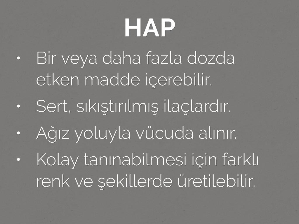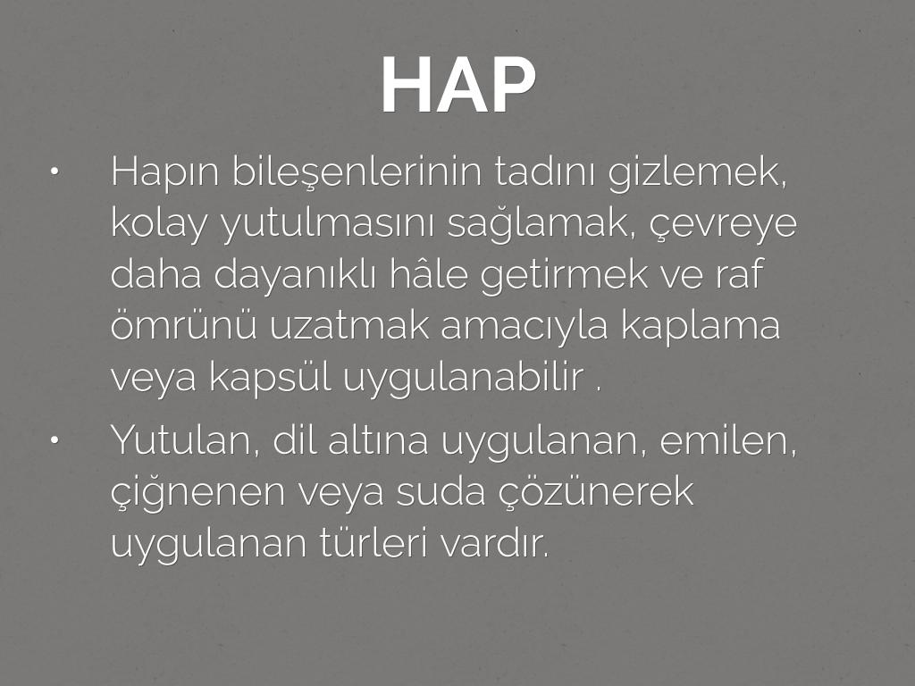 Hapın bileşenlerinin tadını gizlemek, kolay yutulmasını sağlamak, çevreye daha dayanıklı hâle getirmek ve raf ömrünü uzatmak amacıyla kaplama veya kapsül uygulanabilir .