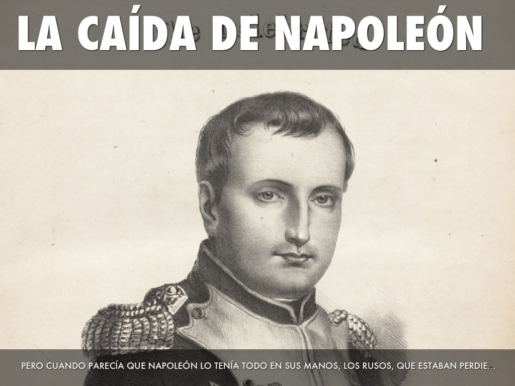 PERO CUANDO PARECÍA QUE NAPOLEÓN LO TENÍA TODO EN SUS MANOS, LOS RUSOS, QUE ESTABAN PERDIENDO MONTONES DE INGRESOS AL CERRAR EL COMERCIO CON INGLATERRA, VOLVIERON A ABRIRLO, Y COMO CONSECUENCIA EL PLAN DE NAPOLEÓN SE DESMORONÓ. POR ESTE MOTIVO, A NAPOLEÓN NO LE QUEDÓ MÁS REMEDIO QUE INVADIR RUSIA, PARA LO QUE PREPARÓ LA GRANDE ARMÉE, UN EJÉRCITO DE MÁS DE MEDIO MILLÓN DE HOMBRES. CUANDO NAPOLEÓN LLEGÓ A MOSCÚ, SE ENCONTRÓ UNA CIUDAD ABANDONADA, SIN COMIDA Y SIN POBLACIÓN, YA QUE LOS RUSOS SE HABÍAN IDO DE LA CIUDAD PARA REFUGIARSE Y DEJAR SIN VÍVERES AL EJÉRCITO FRANCÉS, QUE SE VIO OBLIGADO A RETIRARSE POR LAS TIERRAS QUE ANTERIORMENTE HABÍA SAQUEADO Y QUE POR LO TANTO, ESTABAN VACÍAS. LA GRANDE ARMÉE NO PUDO SOPORTARLO Y SUS SOLDADOS FUERON MURINDO UNO DETRÁS DE OTRO, DE FRÍO, O DE HAMBRE. TRAS LA PERDIDA DE CASI TODO SU EJERCITO, FRANCIA FUE DERROTADA POR LAS COALICIONES QUE ENCABEZÓ INGLATERRA Y NAPOLEÓN FUE DESTERRADO A LA ISLA DE ELBA, DE LA QUE ESCAPÓ PARA VOLVER A FRANCIA COMO EMPERADOR PARA RECONSTRUIR EL IMPERIO, PERO EL PAÍS ESTABA MUY DEBILITADO Y SU EJÉRCITO FUE ABATIDO DEFINITIVAMENTE EN LA BATALLA DE WATERLOO (BÉLGICA) EN 1815.