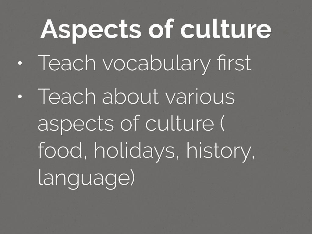 • Teach about various aspects of culture ( food, holidays, history, language)