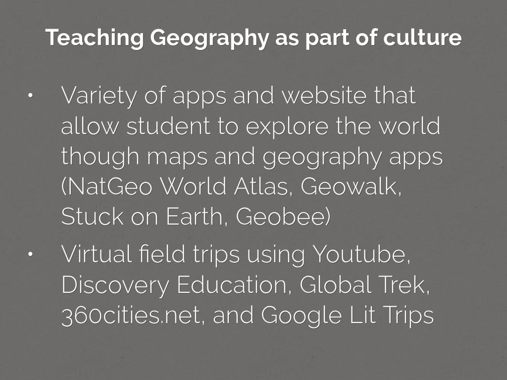 • Virtual field trips using Youtube, Discovery Education, Global Trek, 360cities.net, and Google Lit Trips