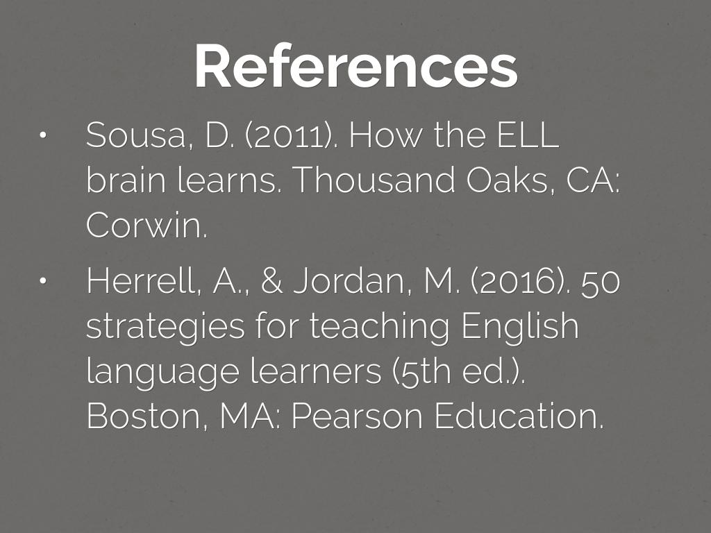 • Sousa, D. (2011). How the ELL brain learns. Thousand Oaks, CA: Corwin.