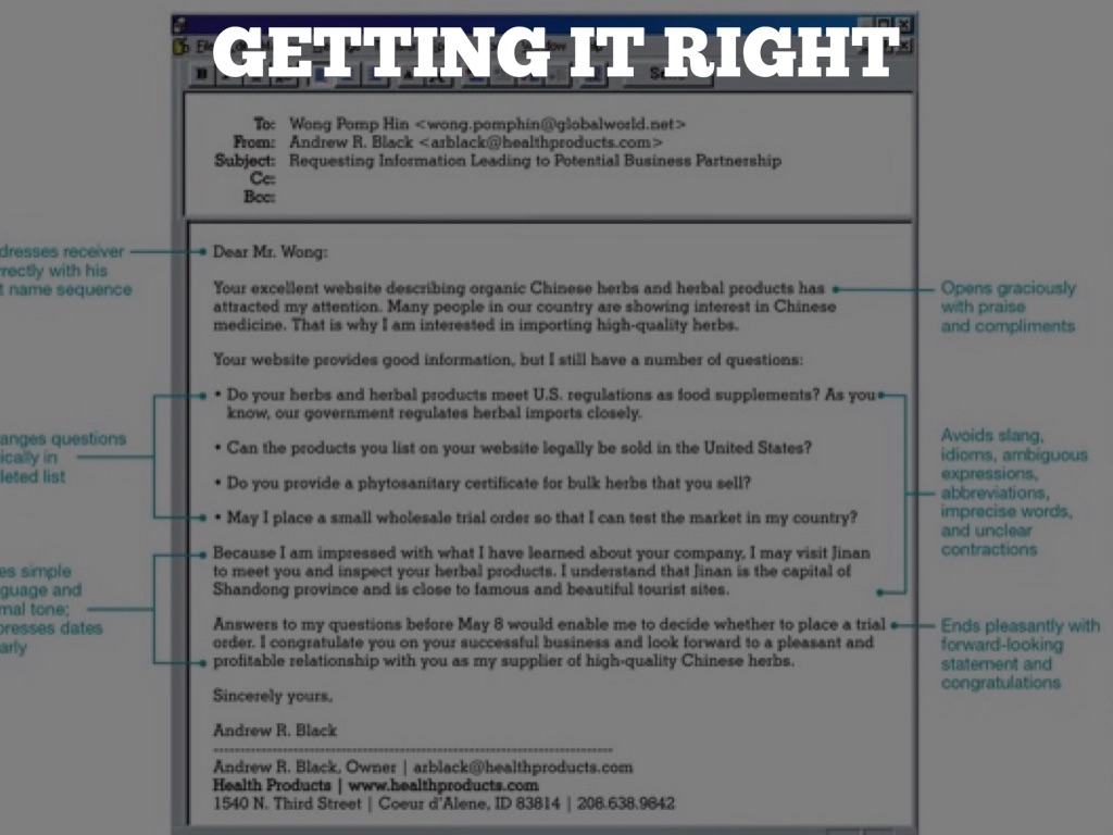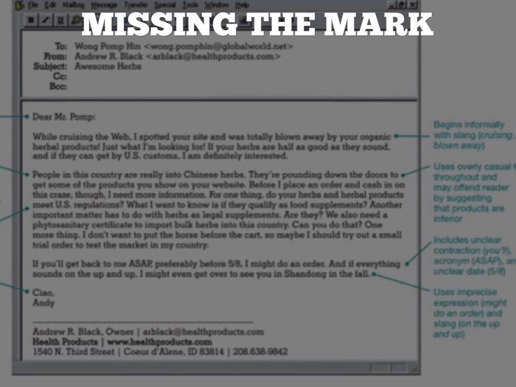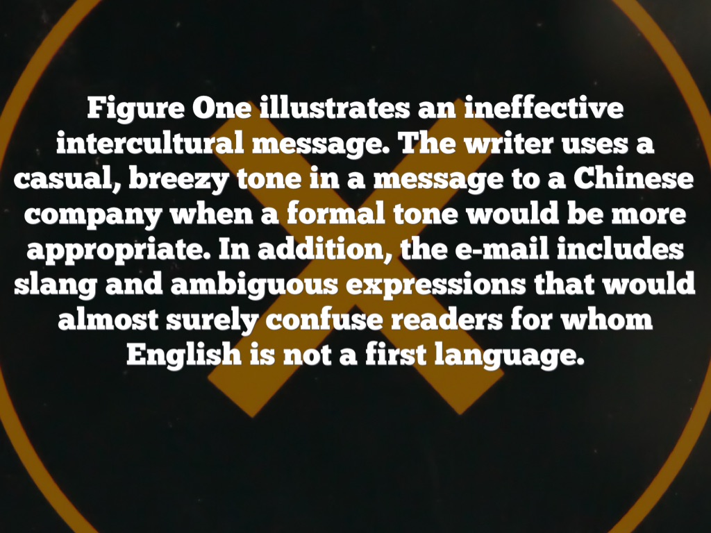 Figure One illustrates an ineffective intercultural message. The writer uses a casual, breezy tone in a message to a Chinese company when a formal tone would be more appropriate. In addition, the e-mail includes slang and ambiguous expressions that would almost surely confuse readers for whom English is not a first language.