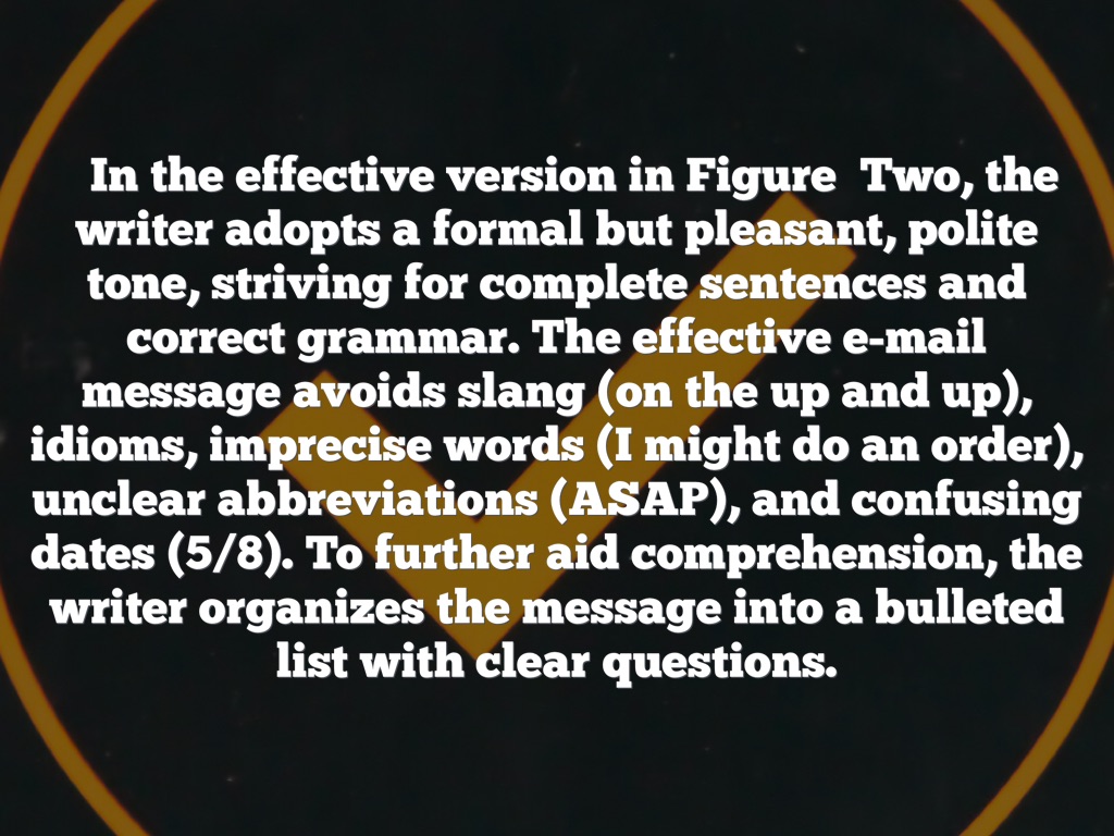 In the effective version in Figure Two, the writer adopts a formal but pleasant, polite tone, striving for complete sentences and correct grammar. The effective e-mail message avoids slang (on the up and up), idioms, imprecise words (I might do an order), unclear abbreviations (ASAP), and confusing dates (5/8). To further aid comprehension, the writer organizes the message into a bulleted list with clear questions.