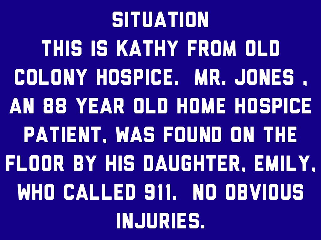 This is Kathy from Old Colony Hospice. Mr. Jones , an 88 year old home hospice patient, was found on the floor by his daughter, Emily, who called 911. No obvious injuries.
