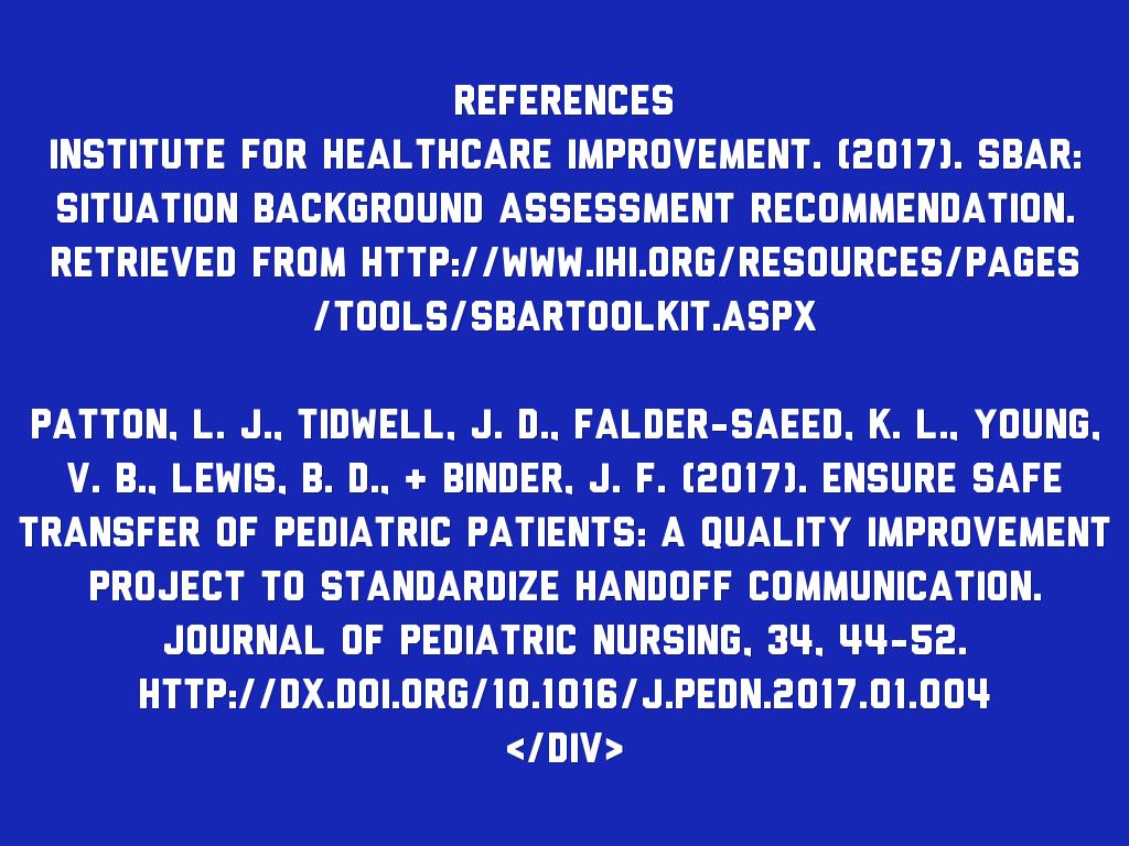 Patton, L. J., Tidwell, J. D., Falder-Saeed, K. L., Young, V. B., Lewis, B. D., & Binder, J. F. (2017). Ensure safe transfer of pediatric patients: A quality improvement project to standardize handoff communication. Journal of Pediatric Nursing, 34, 44-52. http://dx.doi.org/10.1016/j.pedn.2017.01.004