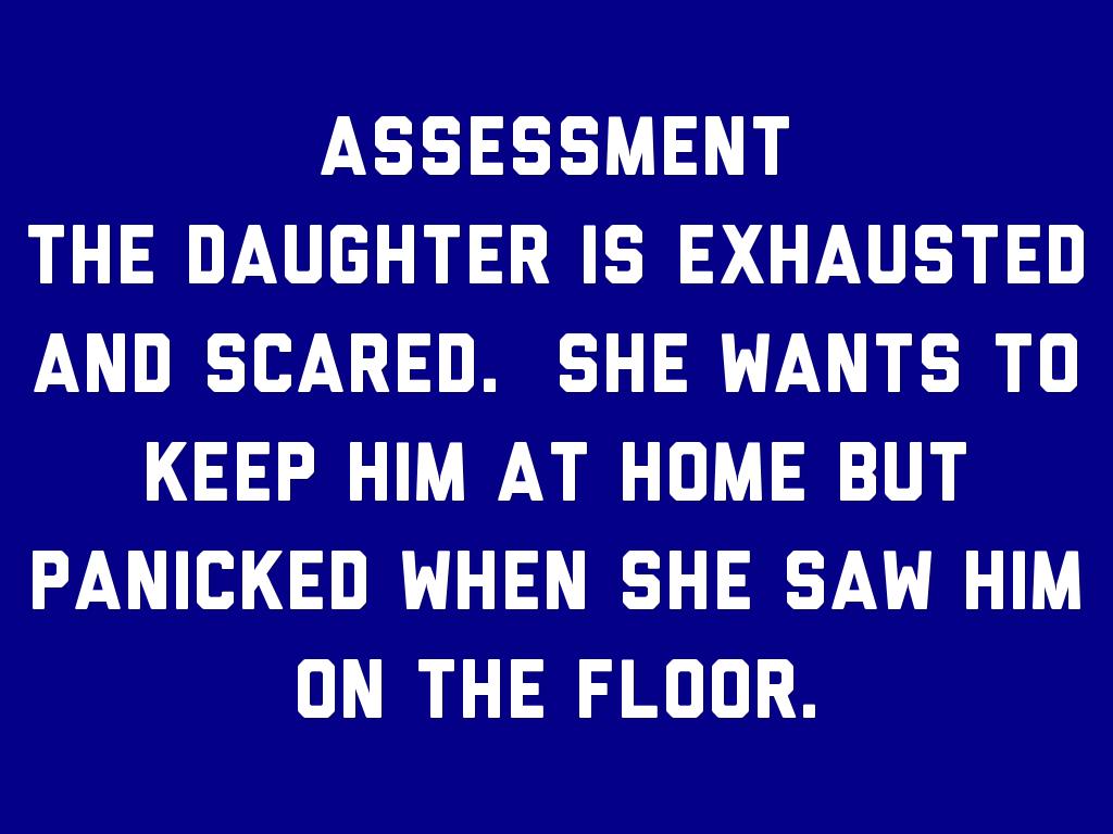 The daughter is exhausted and scared. She wants to keep him at home but panicked when she saw him on the floor.