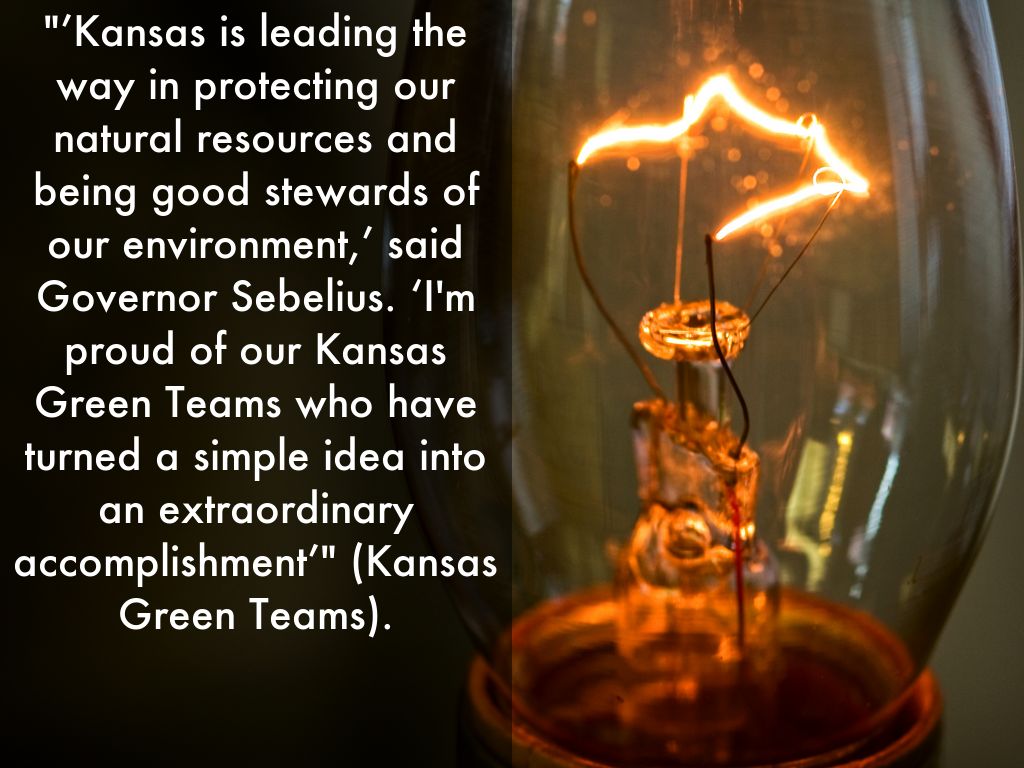 "’Kansas is leading the way in protecting our natural resources and being good stewards of our environment,’ said Governor Sebelius. ‘I'm proud of our Kansas Green Teams who have turned a simple idea into an extraordinary accomplishment’" (Kansas Green Teams).