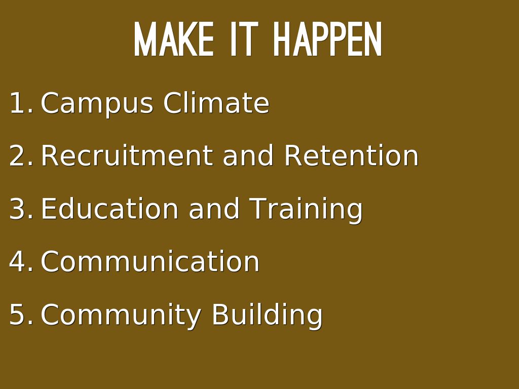 Climate: To foster a campus environment that respects differences while climate encouraging inclusiveness.